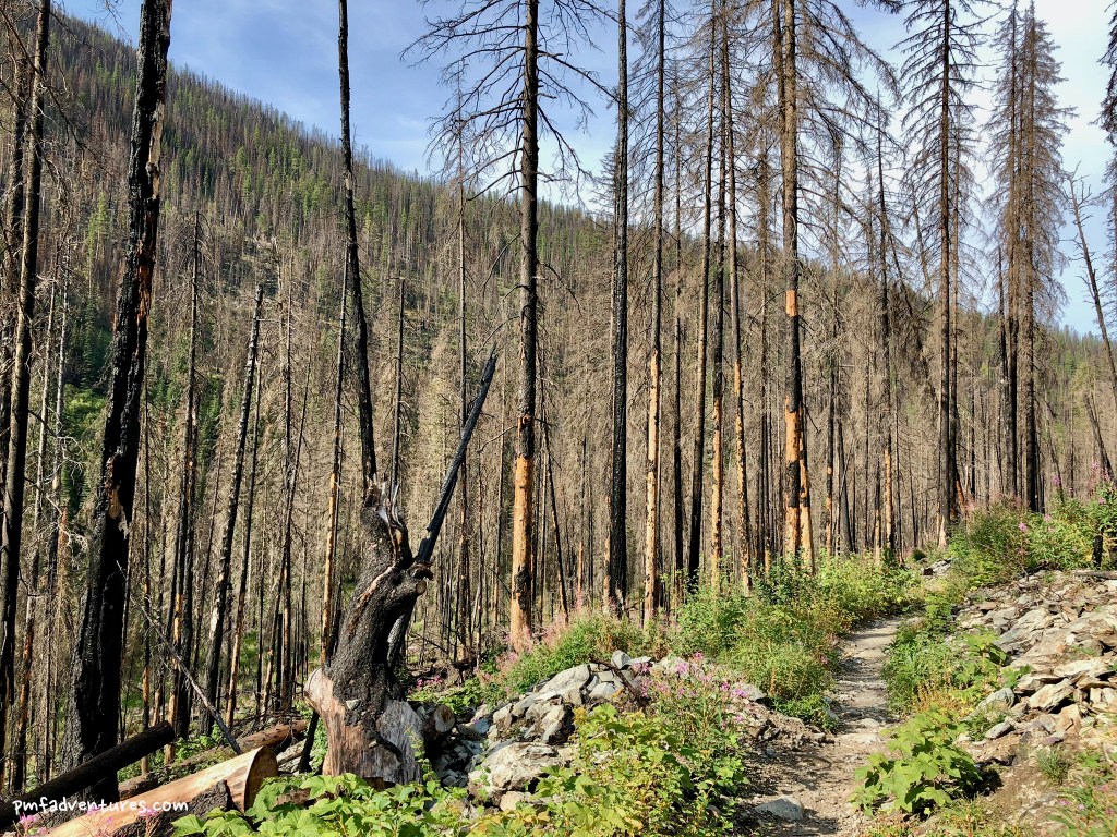 Looking back towards the chalet from the trail up to Comeau Pass, you can really see the burn line