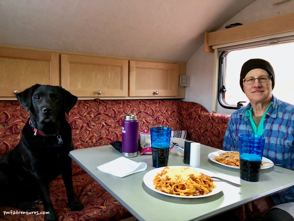 It was windy outside, so we had dinner in the camper