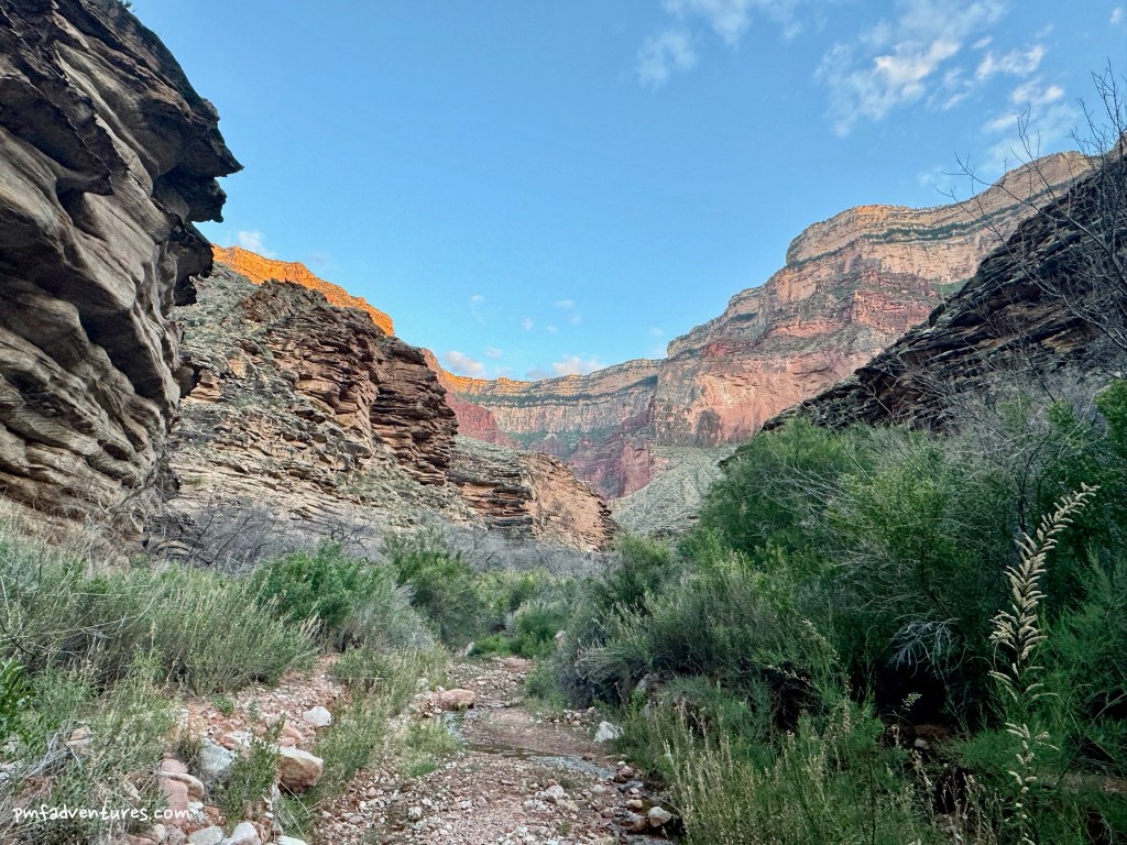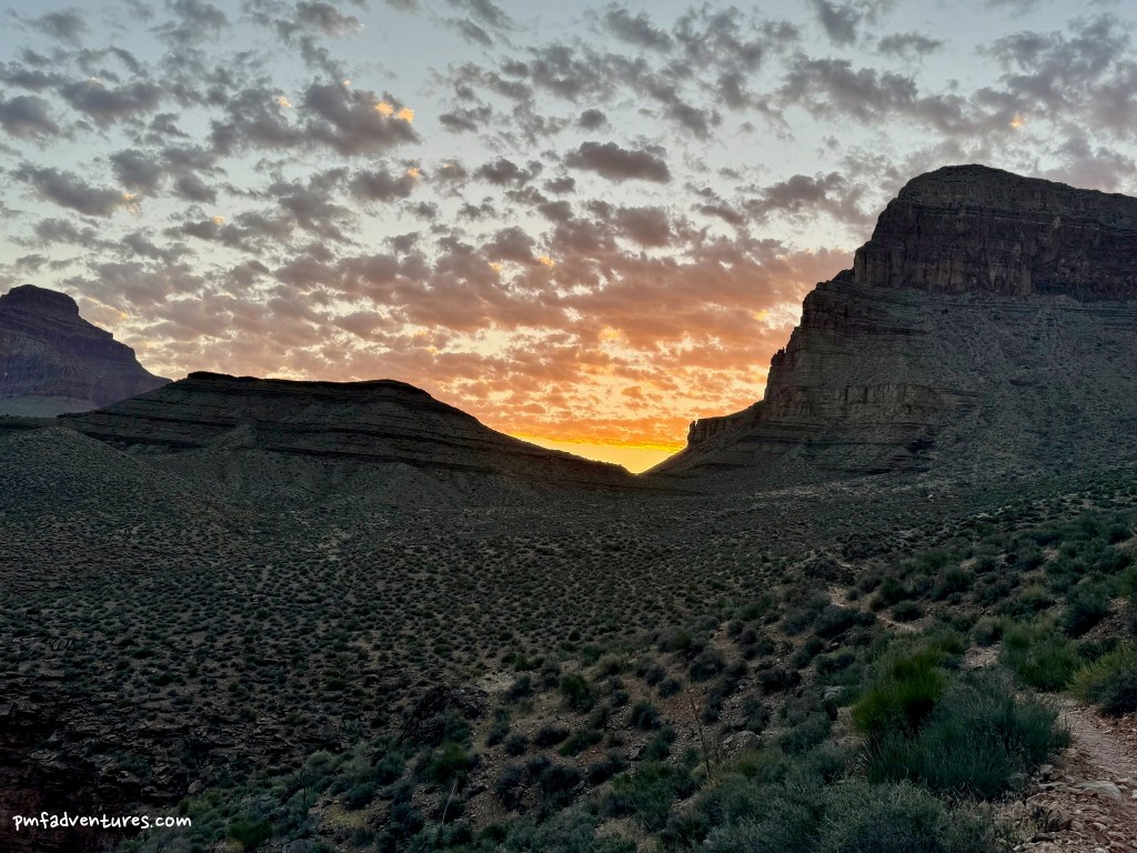 The first day of our backpack was a short one – just 4.5 miles and 3,000 feet down the Bright Angel Trail to Havasupai Gardens Campground. But because it was supposed to get pretty warm, we got an early start. We were on the trail around 6:30 AM and made it to camp at 10 AM, after two short stops at the 1.5 Mile and 3 Mile Resthouses. We got to see a park service mule train headed down the trail while we were stopped at 3 Mile. When we got to camp, we scored the shadiest site (#8) and settled in for the rest of the day. But it wasn’t a super relaxing day, as there was almost continual helicopter traffic overhead, moving equipment and supplies for the Transcanyon Waterline Project. After an early dinner, we headed out a short ways on the Tonto East Trail to enjoy the evening light. And then we were in our tents by 7:30 PM, as we had alarms set for 4:30 AM the next morning.