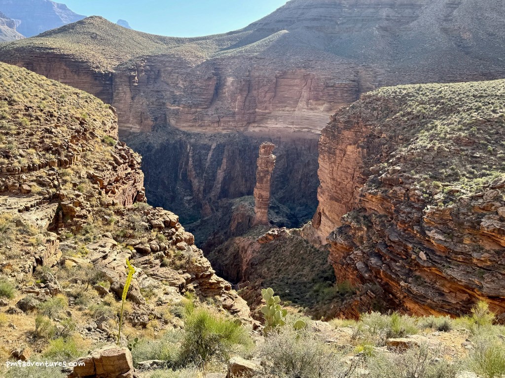 Our second day was when we really got to experience the Tonto Trail. The Tonto Platform is an amazing place to experience the Grand Canyon, as you are really down in it, on a prominent, wide bench that is 3,000 feet below the rim and 1,000 feet above the river. The Tonto Trail traverses this open benchland at the rim of the Inner Gorge and runs for about 95 miles, from Red Canyon to Garnet Canyon. As the crow flies, it is just over 3 miles from Havasupai Gardens to Monument Creek. But the section of the Tonto Trail between those two locations is over 10 miles long, as the trail traverses up and down each side drainage and goes around mesas to stay mostly flat. And because it is on an open bench, there is almost no shade for most of the day.