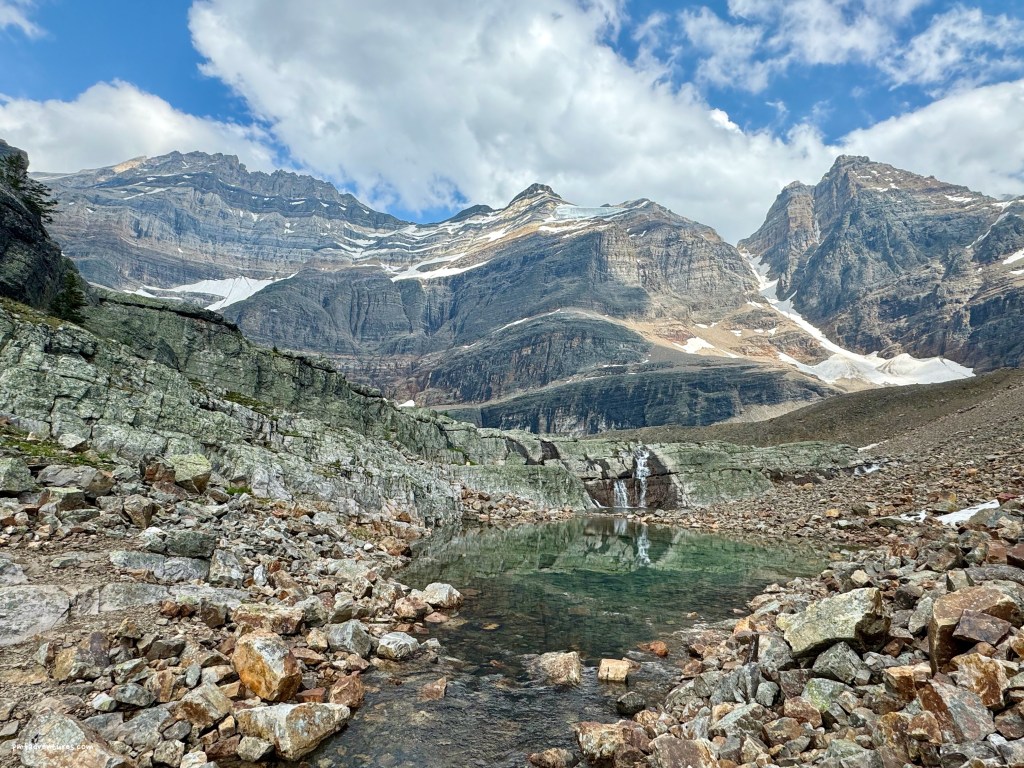 I started by ascending up to Wiwaxy Gap, a steep grind of about 1,700 feet in just under a mile. Although it wasn’t raining when I got to the gap, I could definitely feel mist coming out of the clouds. Then I traversed the Huber Ledges route down to Lake Oesa, passing several cool waterfalls coming off the cliffs along the way. By the time I got to Lake Oesa it was raining, so I donned my raingear and headed across the Yukness Ledges route that traverses Yukness Mountain. When I got to the Obapin Plateau, the rained had stopped and the weather seemed to be clearing, so I headed up to Opabin Lake and then came back to the Obapin Prospect to enjoy the view. At that point, it was clear that the weather was deteriorating, so I opted to head back to camp without finishing the final portion of the circuit. And I was glad I did, as it started pouring as I descended off the Obapin Plateau.