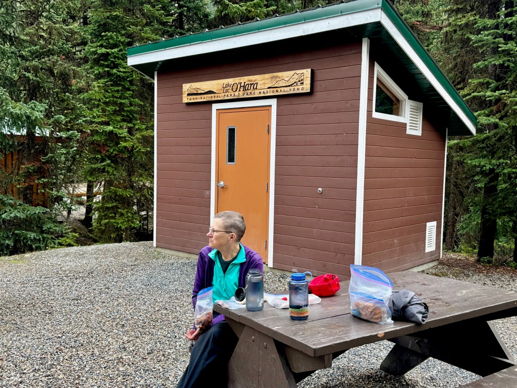 We were in full raingear as we waited for the 10:30 AM bus on August 5, as it was just pouring. By the time we got to the campground, it was still quite cloudy, but it had stopped raining. So we got our camp set up, had a quick snack, and set off on a hike around Lake O’Hara and up to Lake Oesa. The thunderstorms started rolling in as we were descending from Lake Oesa, but fortunately the rain held off until we got down off the exposed talus. We quickly put our raingear back on and finished the hike in pouring rain and occasional hail. We were thankful that the campground has two cooking shelters, as we were able to cook dinner and eat inside out of the rain.